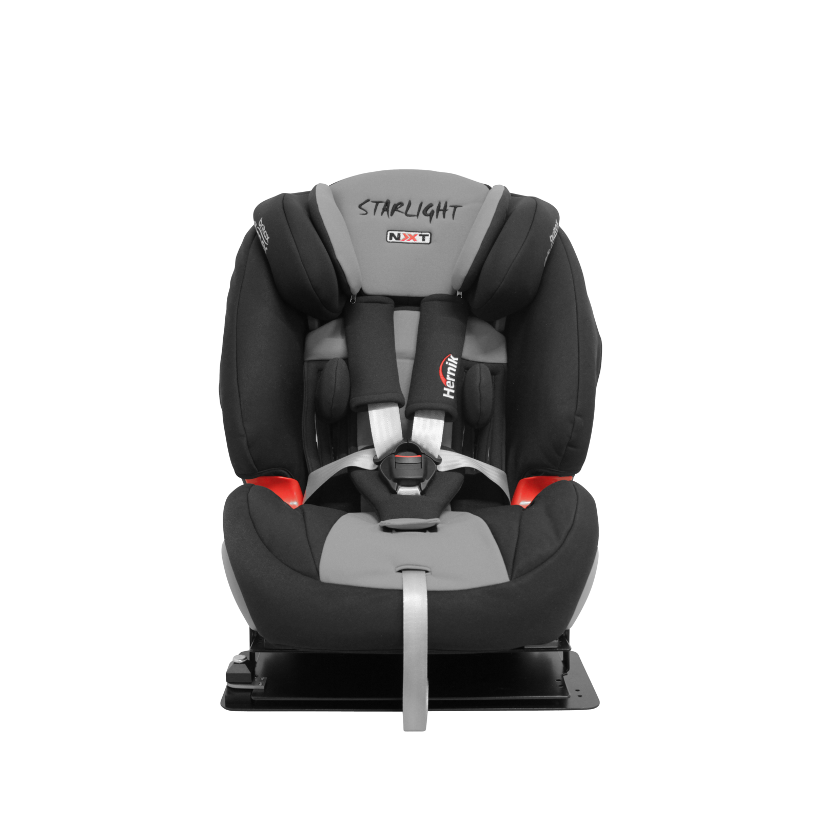 Kėdutės galvos atrama reguliuojama į aukštį, todėl kėdutė gali augti kartu su vaiku. STARLIGHT-NXT automobilinė kėdutė sukomplektuota su fiksuotais porankiais klubų srityje ir šoninio smūgio energijos sugerties elementais pečių ir krūtinės srityse.
