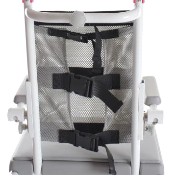 - Dušo-tualeto kėdė yra komplektuojama su tinklinio audinio (užsegama) nugarėle. Nugarinėje pusėje įsiūti keturi sagteliai, leidžiantys optimaliai pritaikyti atlošą pagal individualius naudotojo poreikius (ypač tinkama naudotojams, turintiems skoliozę). Tinklinė medžiaga neįgeria vandens, o jos perforuota struktūra leidžia odai kvėpuoti. Atlošą galima nuimti ir skalbti atskirai – tiesiog atsekite sagtis nugaroje.