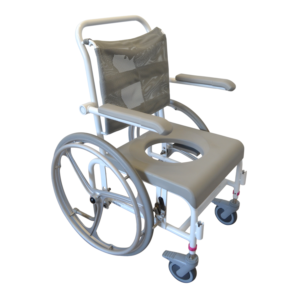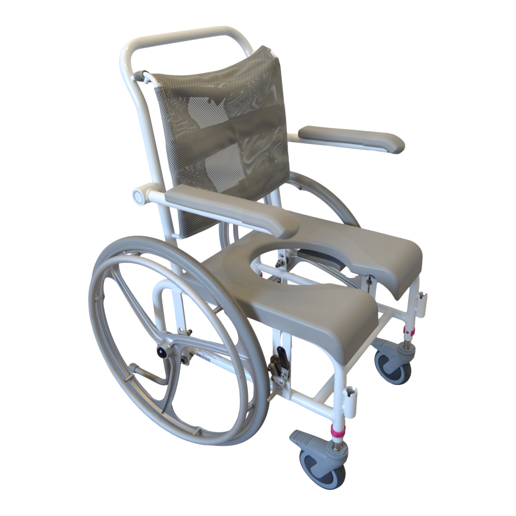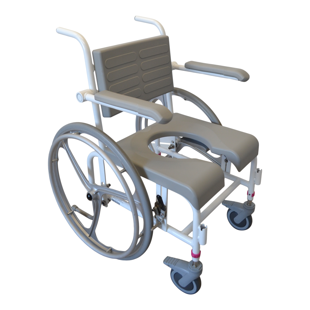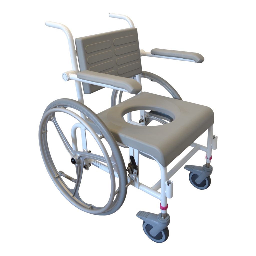 - Standartiškai dušo- tualeto kėdės turi mažus 125 mm priekinius ratukais. Ratukai turi teleskopines kojeles, todėl jų aukštis gali būti reguliuojamas. Jie pagaminti iš nerūdijančio plieno ir turi efektyvią sriegio apsaugą, kuri neleidžia purvui ir plaukams patekti į ašį. Ratukai taip pat turi dvigubo veikimo stabdžius.